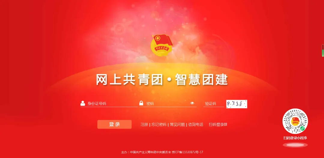 【注】①若显示身份证或密码错误,请联系原就读学校团组织管理员确定本人是否已录入“智慧团建”系统。若确认在系统内,可点击[忘记密码]进行修改,并联系本级或直属上级团支部管理员生成[重置密码验证码];②智慧团建系统只能在电脑PC端登陆。