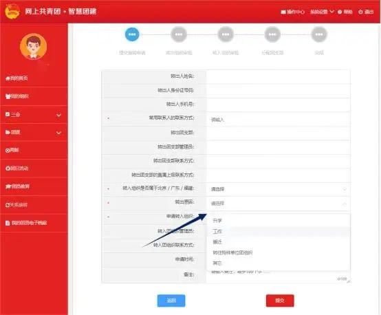 (5)转接原因一未升学或未落实就业去向:填写户籍地或居住地详细地址、转入组织。所有未升学或未就业一律于6月30日前转回户籍地或居住地的团支部(请提前联系所在村、社区)。