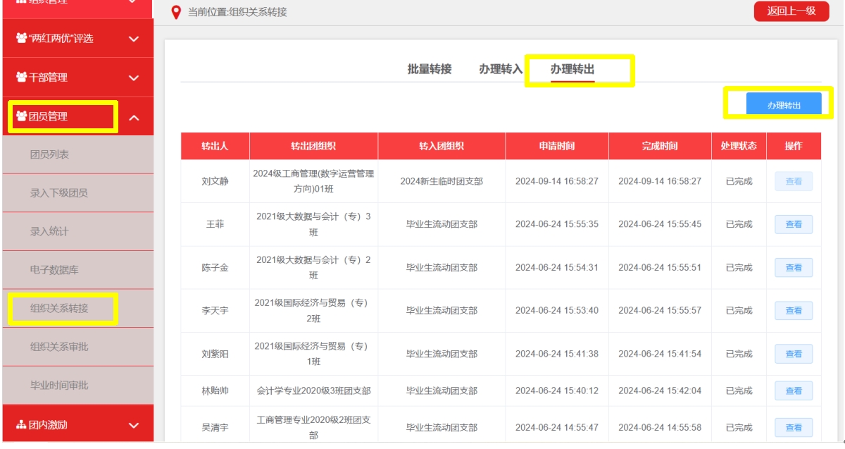 方法2:团支书(团支部管理员)进入管理中心,点击“团员管理-组织关系转接”菜单,点击“办理转出”,选择转出团支部、转出人姓名、转入组织是否属于北京/广东/福建、转出原因,根据提示完成转接。
