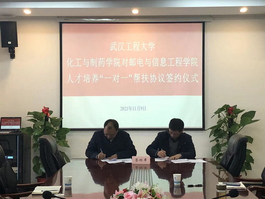 (通讯员 胡培)2021年11月9日下午,武汉工程大学化工与制药学院对邮电与信息工程学院人才培养“一对一”帮扶协议签约仪式在流芳校区化工楼六楼会议室举行,这标志着举办高校对独立学院人才培养“一对一”帮扶揭开新篇章。出席此次签约仪式的有武汉工程大学化工与制药学院党委书记王雪梅,院长汪铁林,副院长龙思会、金放,院长助理刘根炎,邮电与信息工程学院院长冯兵,副院长欧阳琼,教务部部长王仕仙,化工与材料工程学院院长宣爱国,党总支书记胡培。本次签约仪式由化工与制药学院党委书记王雪梅主持。