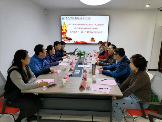 (通讯员 杨玉蓓)为提高我院人才培养能力,推动我院学科建设,促进教师发展,2021年11月26日下午,武汉工程大学计算机科学与工程学院、人工智能学院和邮电与信息工程学院人才培养“一对一”帮扶协议签约仪式在计算机学院办公楼318会议室举行。出席此次签约仪式的有武汉工程大学计算机科学与工程学院、人工智能学院党委书记张炜,副院长卢涛、刘军,党委副书记赵小硕,院长助理刘玮,邮电与信息工程学院党委书记董光尚,党委副书记兼副院长田艺,副院长欧阳琼,教务部副部长杨依依,计算机与信息工程学院(人工智能学院)院长赵振华,党总支书记余子牛,教学副院长杨玉蓓。本次签约仪式由邮电与信息工程学院副院长欧阳琼主持。