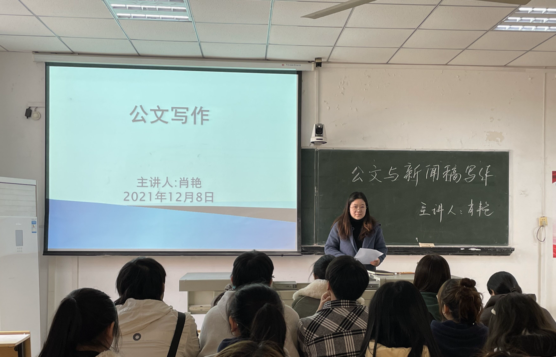 (通讯员 赵亦杨)2021年12月8日下午,外语学院邀请马克思主义学院肖艳老师在1教1308教室举行了一场以“公文与新闻写作”为主题的培训讲座。外语学院全体教师和学生会宣传部学生代表聆听了讲座,讲座由外语学院副院长温偲睿主持。