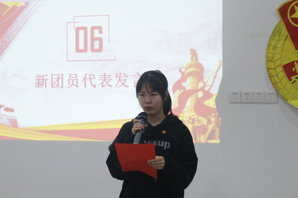 外语学院朱梦凡同学作为新团员代表发言,她呼吁全体新发展团员努力做一名优秀的共青团员,做品学兼优的好学生,以优异的成绩回报老师、回报学校、回报社会、回报祖国。