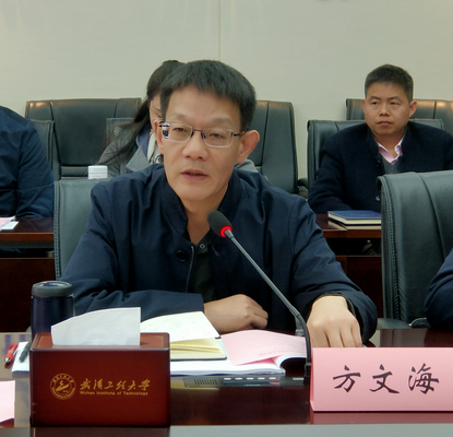 武汉工程大学教务处长王海晖发言。他认为,本次工作推进会召开意义重大,旨在通过双方合作实现共赢。教务处将全方位支持协议中涉及的各项内容,共同克服新困难,解决新问题,创造新成绩。
