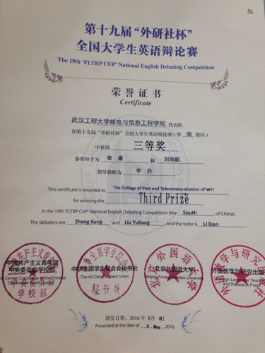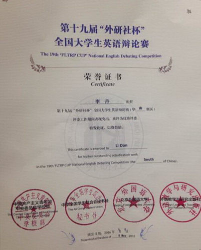 (通讯员 李春英)2016年5月6日至8日,第十九届“外研社杯”全国大学生英语辩论赛华南赛区决赛在南方医科大学举行。来自湖北、湖南、广东、福建、云南、广西等地的124所高校参加了本次比赛。经过模拟赛和5轮循环赛的激烈角逐,最终我院学子张康和刘雨航同学荣获三等奖,李丹老师荣获“优秀评委”称号。