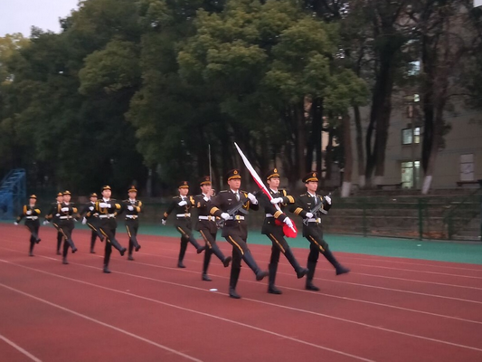 鲜艳的五星红旗伴随着雄壮的义勇军进行曲在晨曦中冉冉升起,全体师生高唱国歌,行注目礼。