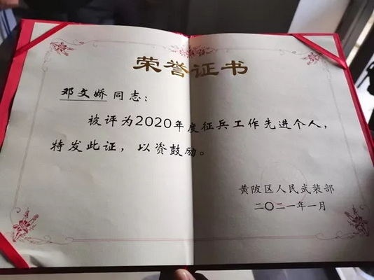 邓文娇同志被评为黄陂区2020年度征兵工作先进个人
