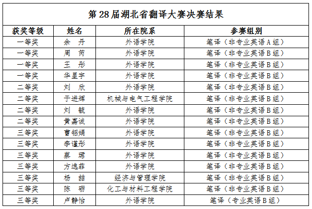 (通讯员 温偲睿)第28届湖北省翻译大赛决赛结果于近日揭晓。经过初赛和复赛两轮激烈选拔,我院15名学生在多个组别的比赛中收获奖项,其中一等奖4项、二等奖4项、三等奖7项。