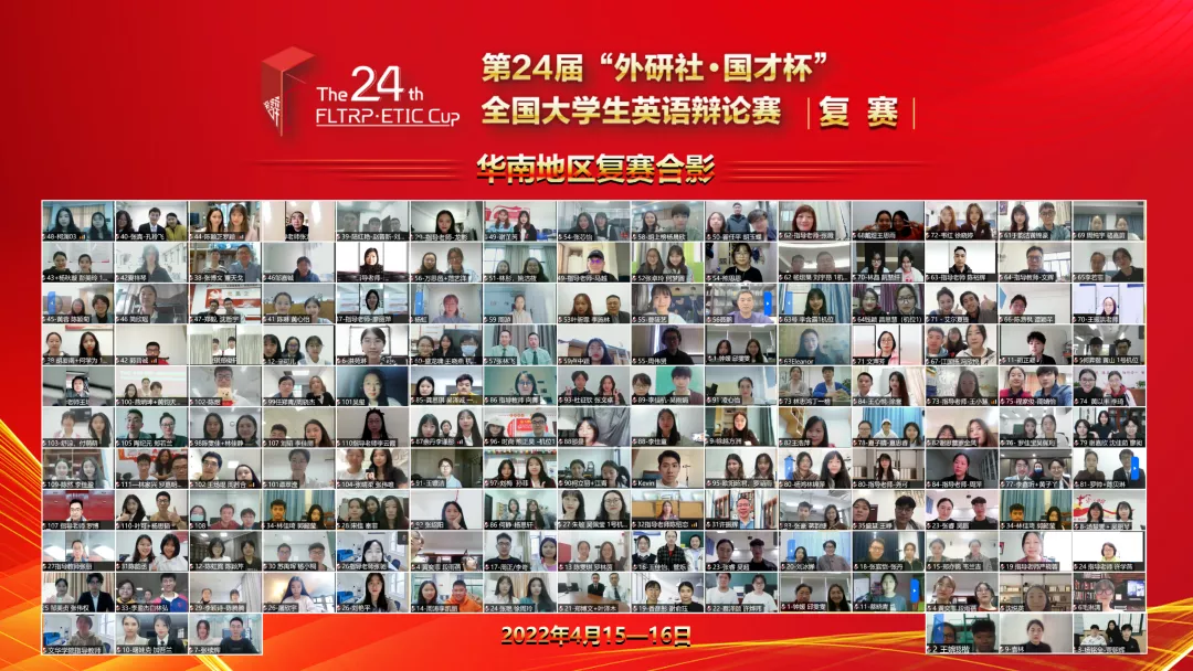 (通讯员 潘凡)2022年4月16日,第24届“外研社·国才杯”全国大学生英语辩论赛华南地区复赛在线上落下帷幕。来自中山大学、广东外语外贸大学、香港中文大学等共111支高校队伍参加了华南赛区比赛。经过两天五轮的激烈比拼,外语学院李瑾彤、余丹两位同学荣获三等奖,潘凡老师荣获指导教师三等奖。