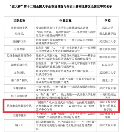 (通讯员 高静)经过近7个月激烈角逐,“正大杯”第十二届全国大学生市场调查与分析大赛(本科组)湖北赛区选拔赛于2022年4月27日圆满落幕。我院高静、陈静、宋彦朋三位老师带领经济与管理学院宋怡涵、魏凌怡、王鑫以及建筑工程学院黄中健四位同学组成的“脑细胞在和我们作队”,以《“国潮风”吹向沉浸式实体商业中心的破局出圈与消费市场发展分析研究——以武汉光谷K11购物艺术中心为例》,表现优异,荣获全国三等奖。