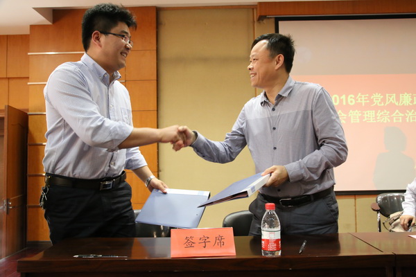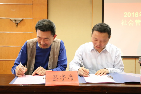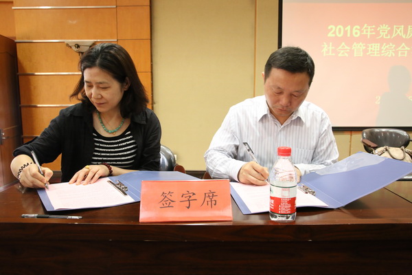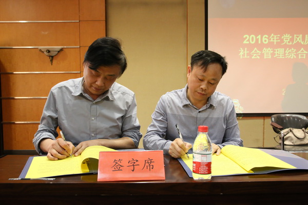 学院党委书记邓新洲、院长黄志良与二级单位代表负责人签订《2016年党风廉政建设责任书》、《2015年度社会管理综合治理目标管理责任书》、《2015年度消防安全责任书》。