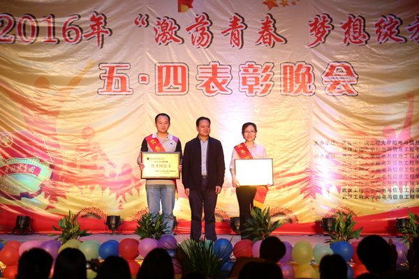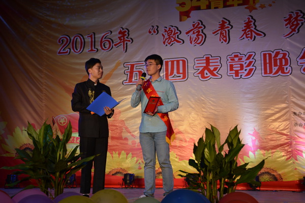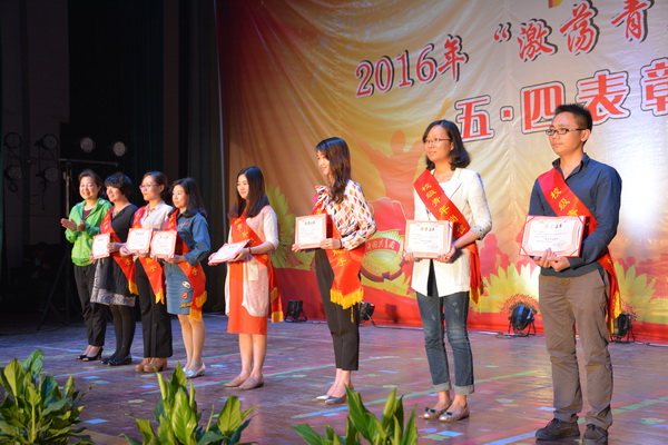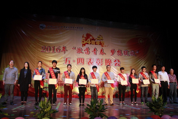 晚会中进行了五·四评优的表彰。“优秀团总支”、“魅力团总支书记”、“十佳团支部”、“十佳共青团员”、“优秀青年志愿者服务团队”、“十佳青年志愿者”、“青年岗位能手”等先进集体和先进个人获奖代表依次上台领奖。