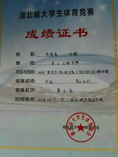 (通讯员袁宏怡)5月27—29日,2016年湖北大学生羽毛球锦标赛在武汉城市职业学院举行,来自武汉大学、华中科技大学等50多所高校代表队参赛。我院羽毛球代表队冯腾、苏俊亮两位同学在袁宏怡老师的带领下参加了比赛。面对来自985、211等高校的强劲对手,我院代表队不畏挑战、锐意进取、奋勇争先,以强大的心理控制力、良好的配合、较高的竞技水平杀入甲组男子双打前8强,获得第五名的好成绩。