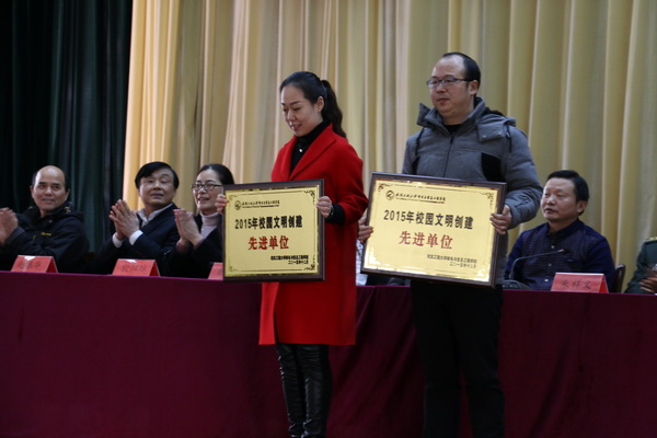 主席台领导还为在2015年校园文明创建工作中表彰突出的先进单位、先进个人颁发了荣誉证书。