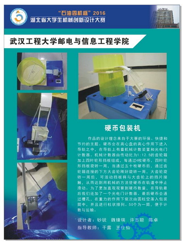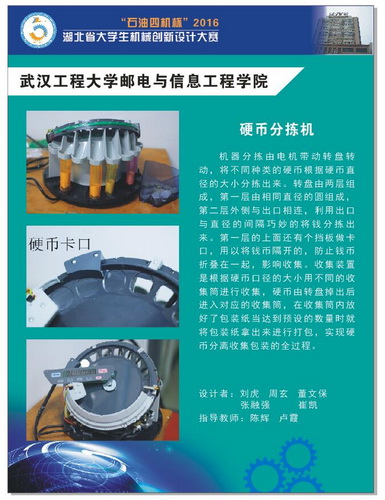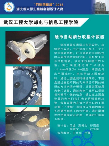 本次大赛由湖北省教育厅主办,长江大学承办。大赛的主题为“服务社会——高效、便利、个性化”;内容为“钱币的分类、清点、整理机械装置;不同材质、形状和尺寸商品的包装机械装置;商品载运及助力机械装置”。来自华中科技大学、武汉理工大学、武汉工程大学、湖北工业大学等51所高校参加了比赛,参赛作品达287件。