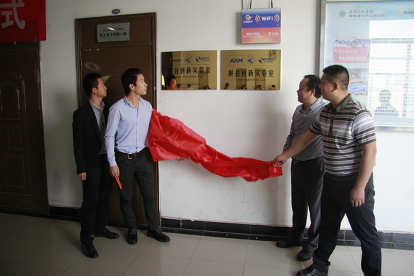 院党委书记邓新洲与飞思卡尔半导体有限公司大学计划部负责人董景杰、安谋电子科技公司(ARM Holdings)大学计划部负责人洪川、蓝宙电子科技公司董事长王江共同为联合创新实验室揭牌,标志着“武汉工程大学邮电与信息工程学院—飞思卡尔—蓝宙电子联合实验室、武汉工程大学邮电与信息工程学院—ARM—蓝宙电子联合实验室”正式成立。随后,飞思卡尔半导体公司、ARM公司和蓝宙电子公司对我院联合实验室进行了捐赠,院党委书记邓新洲对三家公司的捐赠表示衷心的感谢。