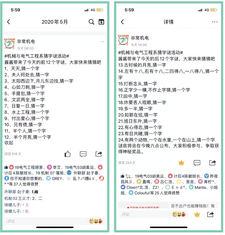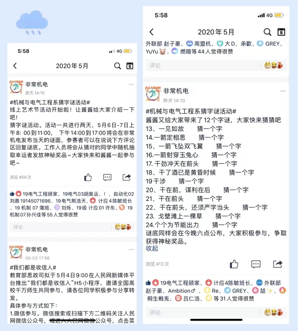 校园文化艺术节 为了让同学们宅家生活更丰富有趣, 我院机电系在线上开展了猜字谜等活动, 带动了同学们对诗词,字谜等各方面的学习兴趣, 团子们也一起来猜一猜这些字谜吧。