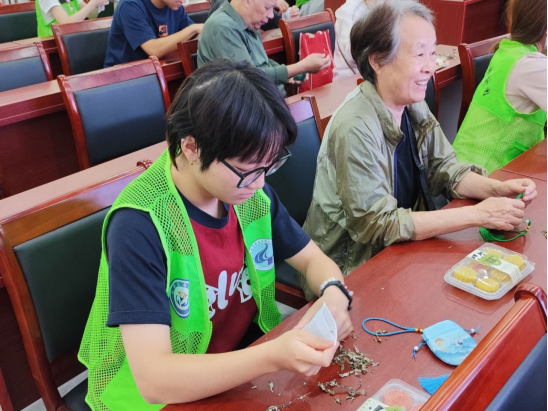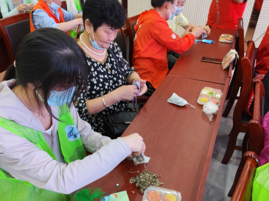 随后,同一场地内,志愿者们与居民共同制作香包。香包作为端午节的传统习俗,不仅寓意驱邪避疫,更增添了节日的喜庆氛围。