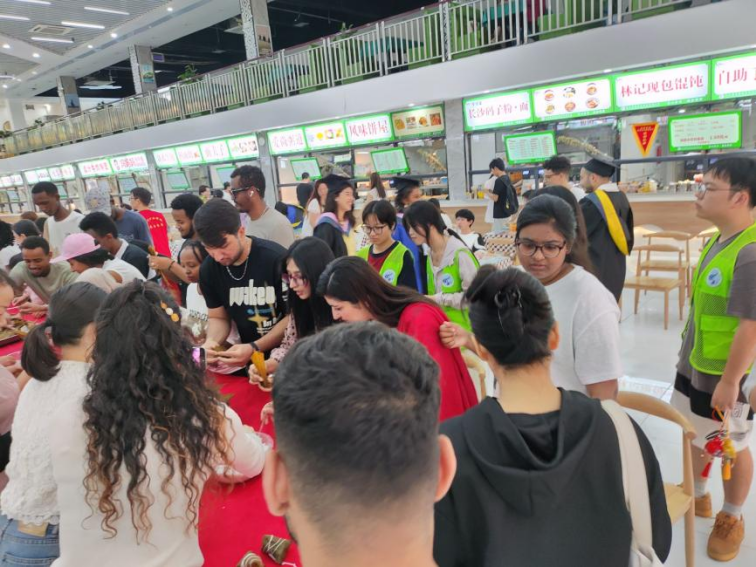 10:40至12:00,活动移至工程大学第二食堂。武汉工程大学国际学院、资源与安全学院志愿者协会的30名志愿者与10名社区热心居民共同参与包粽子。志愿者们分成小组,在居民的指导下学习包粽子的技巧。粽子包好后,由安诚餐饮有限公司负责煮熟,大家共享劳动成果,其乐融融。